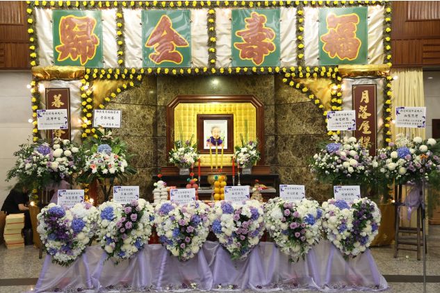 梅小青与妹妹梅小惠的母亲梅刘惠芳的灵堂布置以简约为主,灵堂上方写上“福寿全归”,中间则放置家人的花牌,梅小青的花牌写上“芳心常在”,梅小惠则写上“绝世好妈”。