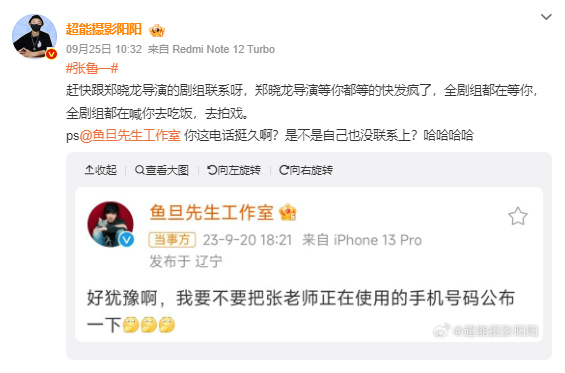 当日晚间,张鲁一工作室官方微博发文澄清:“好犹豫啊,我要不要把张老师正在使用的手机号码公布一下。”此外,张鲁一工作室还在评论区补充称:“鱼旦先生(张鲁一)正闭关创作中……感谢大家想念。”
