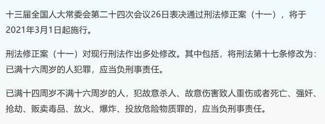 所以除了《未成年人保护法》之外,我们还有《中华人民共和国刑法》。在《中华人民共和国刑法》第十七条的最新修订里,就将刑法第十七条修改为:已满十四周岁不满十六周岁的人,犯故意杀人、故意伤害致人重伤或者死亡、强奸、抢劫、贩卖毒品、放火、爆炸、投放危险物质罪的,应当负刑事责任。