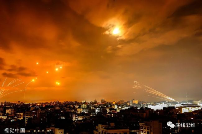 当地时间2023年10月8日凌晨,加沙城,巴勒斯坦武装分子发射的火箭弹被以色列“铁穹”防御系统拦截(图源:视觉中国)