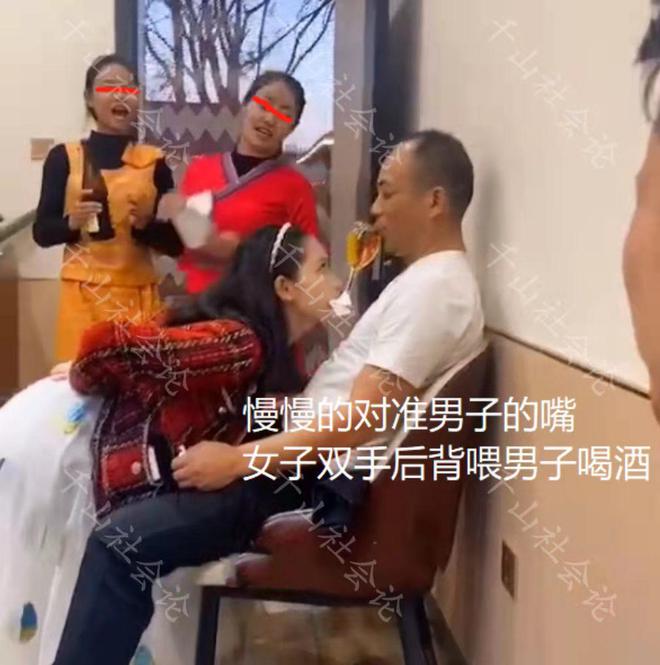 女子用嘴咬住高脚杯,俯身弯腰趴男子身上敬酒,口技出众羡煞旁人