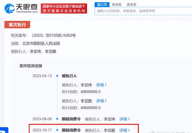 近日,天眼查App显示,因未按时履行生效法律文书确定的给付义务,李亚鹏及哥哥李亚炜被限制高消费,申请人为北京泰和友联投资有限公司,执行法院为北京市朝阳区人民法院。案件流程显示,今年4月,两人已被强制执行4000万。