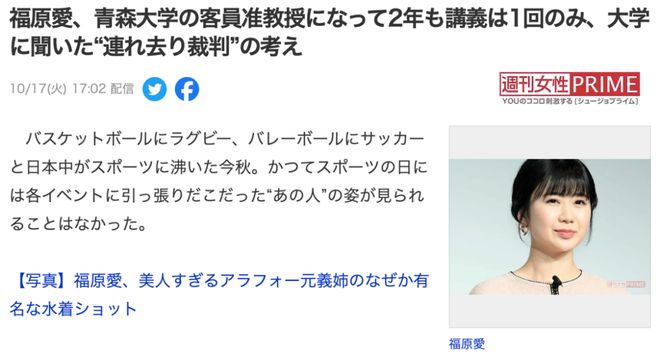 “福原教授于‘21年就任母校青森山田中·高系列的青森大学客座副教授,同年7月离婚后与已婚男性约会的样子等被报道,‘作为教育学生的人物不合适’等声音此起彼伏。就任15个月后的今年6月,终于开始讲课了,但之后又一直处于隐藏状态”(体育报记者)
