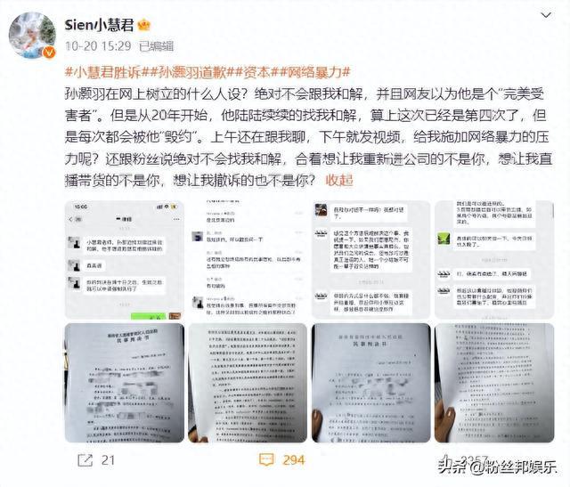 而小慧君表示,孙灏羽在网络上立“完美受害”人设,还跟粉丝说绝对不会和解,声称孙灏羽已经是第四次找她和解撤诉了。