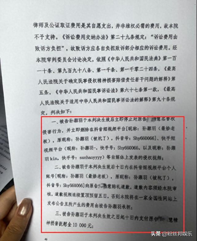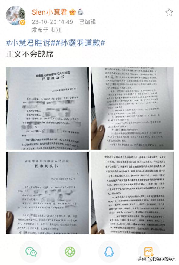 近日,小慧君发布微博晒出了几张民事判决书的图片,她与前老板孙灏羽的一个官司胜诉了。