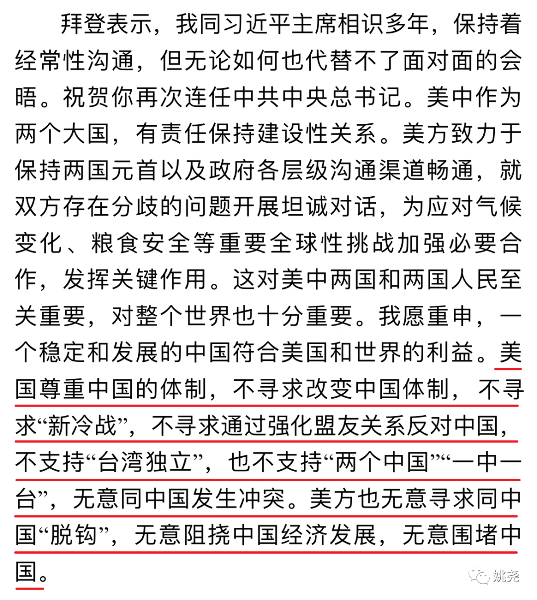 拜登听总书记这么说,不但重申了“四不一无意”,而且还增加了几个“不”和“无意”,在形式上变成了“五不四无意”。