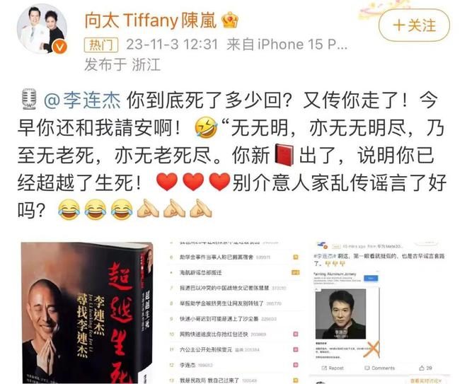 幸好向太及时出面辟谣,说自己早上的时候刚刚见过李连杰,他还活得好好的,顺便还推荐了一波李连杰的新书,才算是让网友放心。