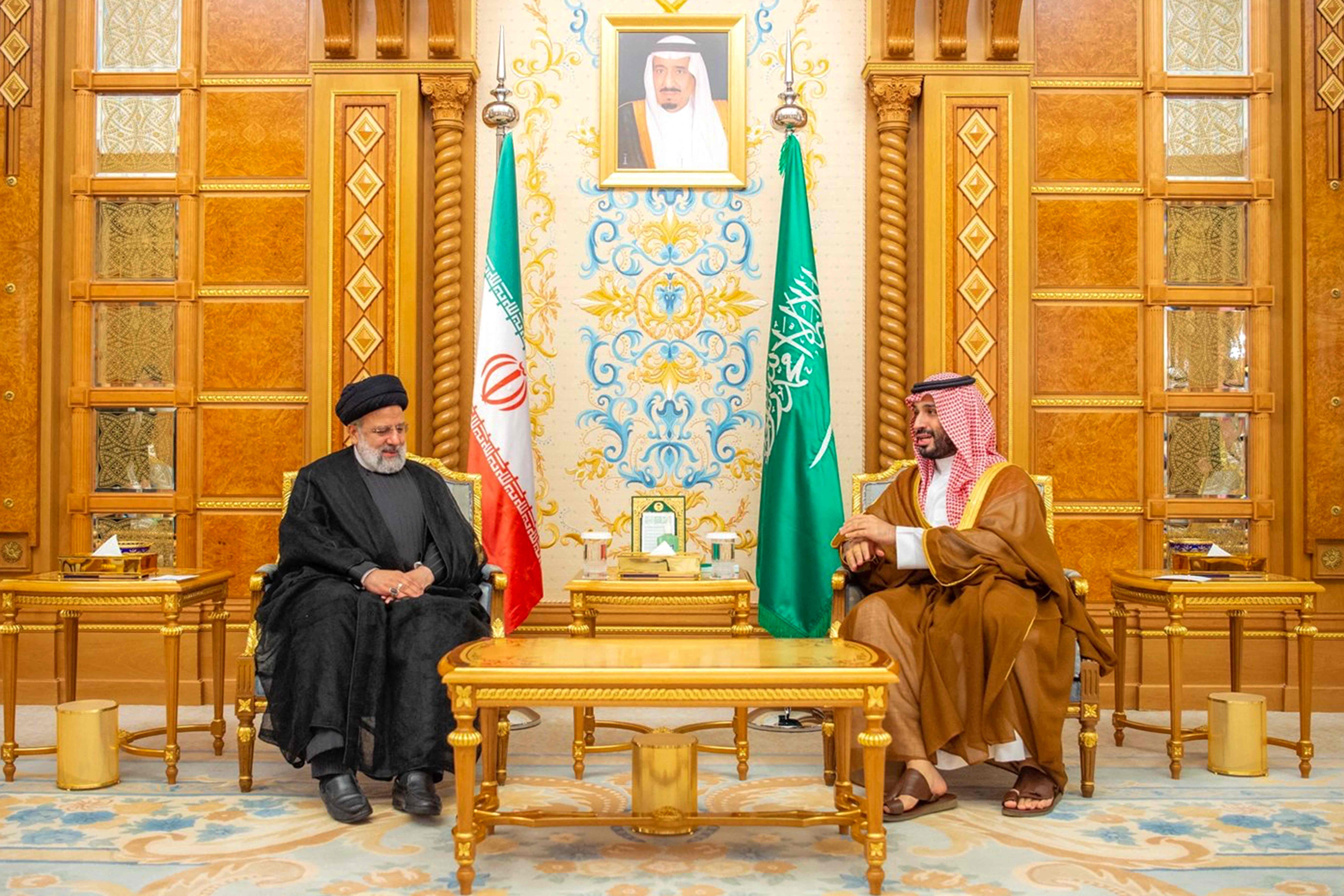 当地时间2023年11月11日,沙特阿拉伯利雅得,沙特阿拉伯王储兼首相穆罕默德·本·萨勒曼(右)在阿拉伯-伊斯兰领导人联合特别峰会期间会见了伊朗总统易卜拉欣·莱希。