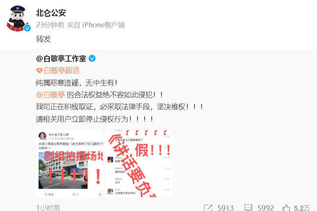 近日,有网友爆料称白敬亭因嫖娼被抓,随后白敬亭工作室辟谣澄清现身的看守所实为剧组的拍摄场地,并表示“纯属恶意造谣,无中生有!白敬亭的合法权益绝不容如此侵犯!我司正在积极取证,必采取法律手段,坚决维权!请相关用户立即停止侵权行为!”北仑公安也转发了白敬亭工作室的辟谣博文。