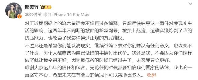 11月24日,都美竹发文疑回应吴亦凡案二审维持原判,称:“对于近期网络上的流言蜚语我不想再过多解释,只想尽快结束这一事件对我现实生活的影响”。并表示:“每个人都应该为自己做错的事情付出代价。无论任何时候都要相信我们国家的法律,我也会一直坚守本心,希望未来在有能力的情况下可以帮助更多人”。
