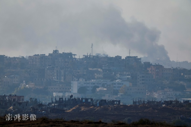 当地时间11月30日,以色列斯德洛特市,眺望远处,加沙地带北部烟雾升腾。图自澎湃影像