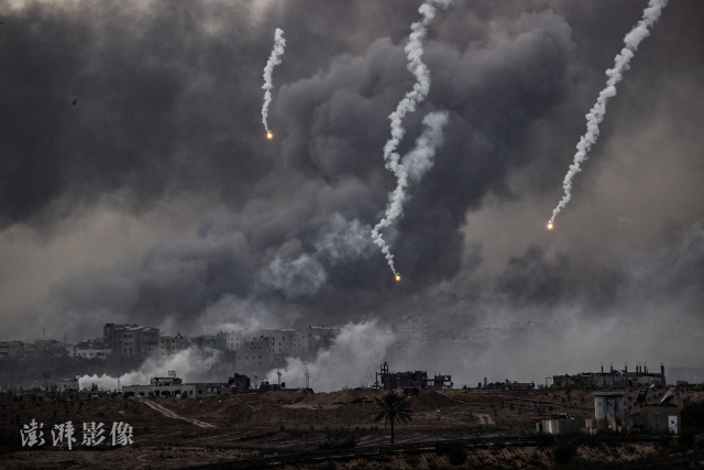 当地时间11月22日,以色列持续袭击加沙,远处满是照明弹的天空浓烟滚滚。图自澎湃影像