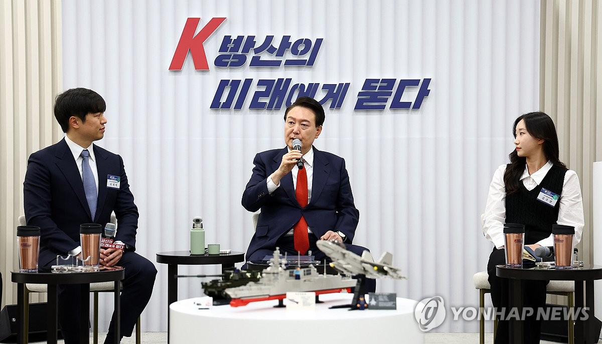 12月7日,在位于京畿道城南市的军工企业LIG Nex1,尹锡悦(中)与军工行业青年人才座谈。图片来源:韩联社