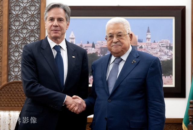 当地时间11月30日,约旦河西岸城市拉姆安拉,美国国务卿布林肯与巴勒斯坦总统阿巴斯举行会谈。图自澎湃影像