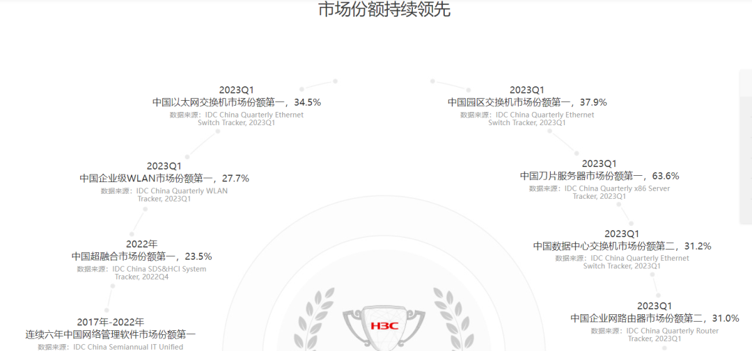 2023年上半年,紫光股份实现营业收入360.45亿元,同比增长4.78%。其中新华三营收249.91亿元,同比增长4.87%,占据紫光股份近七成营收。新华三是纯正的华为血统出身的企业,在荣耀独立之前,也是华为系企业中目前规模最大的,它生产交换机,路由器,网络安全等保设备,服务器等产品,和华为实际上是竞争关系。