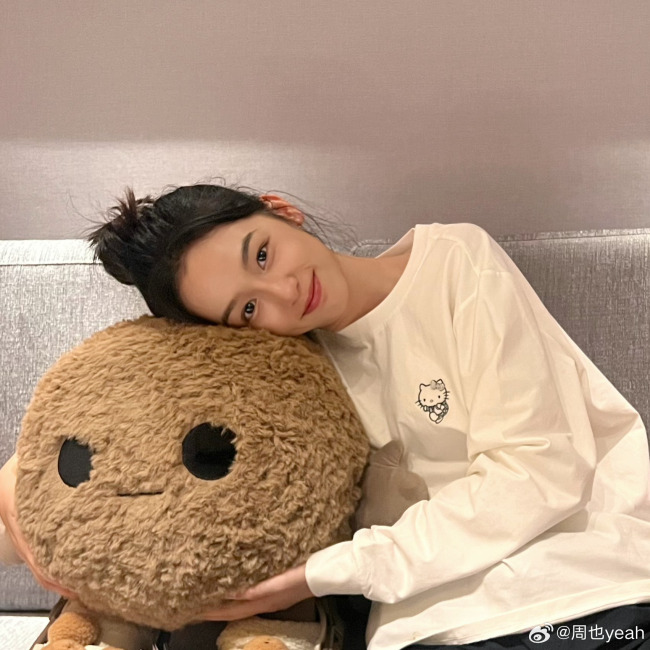 周也的一组宅家美照曝光,她扎丸子头身穿白色休闲装随性自在,抱玩偶合影,嘟嘴卖萌超可爱。