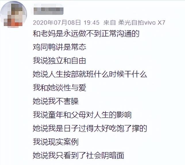 “不是我不愿跟父母沟通,只是收到了太多来自父母的否定、纠正、质疑,永远得不到正确的反馈,一次次挫败,也就不想跟父母交流了。”