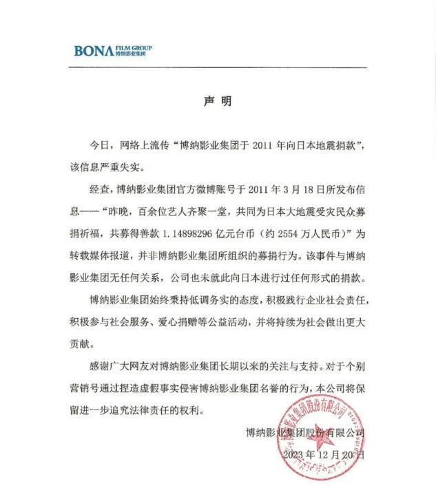 舆论到了这种地步,博纳也不能坐视不理,之后发布了澄清声明,表示网上所说的日本地震中的捐款,是湾湾艺人为日本募捐的新闻,这钱也不是博纳出的。