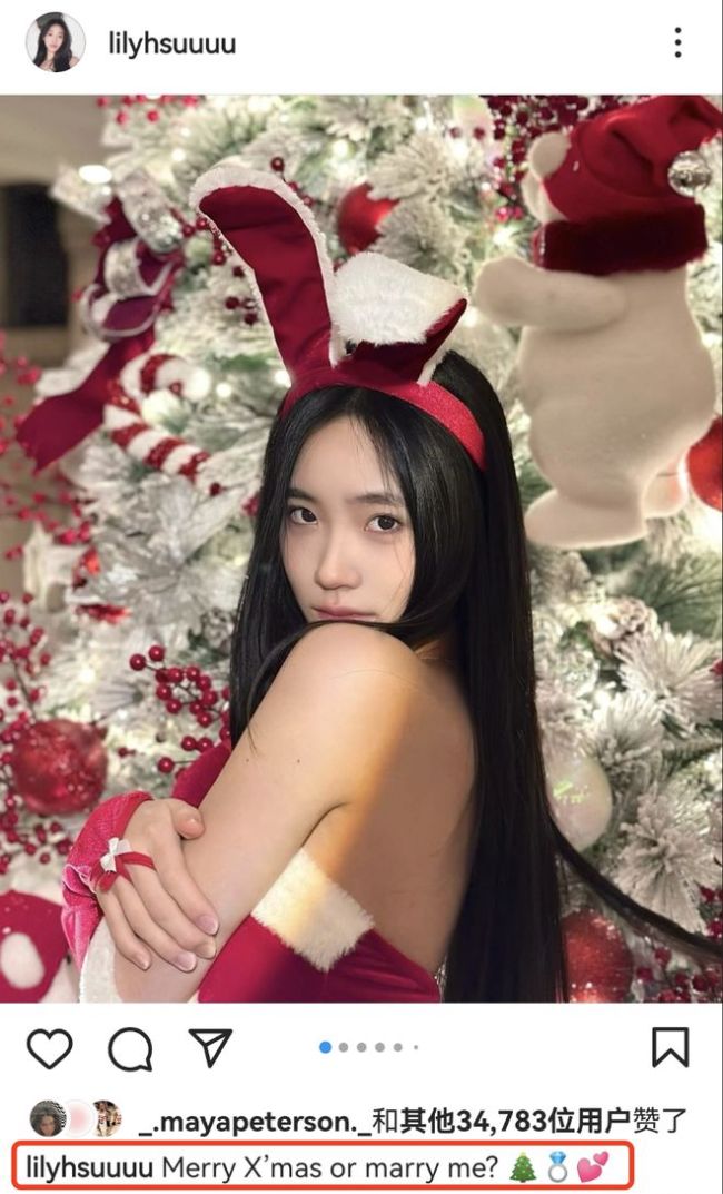 小S的二女儿许韶恩今年16岁,但是这一两年来的穿着却越来越像二十几岁的成年女性。圣诞节前夜,Lily穿成了一个兔女郎,美得让人挪不开眼睛。Lily还幽默地称:Merry X'mas or marry me?是圣诞节快乐呢还是和我结婚?