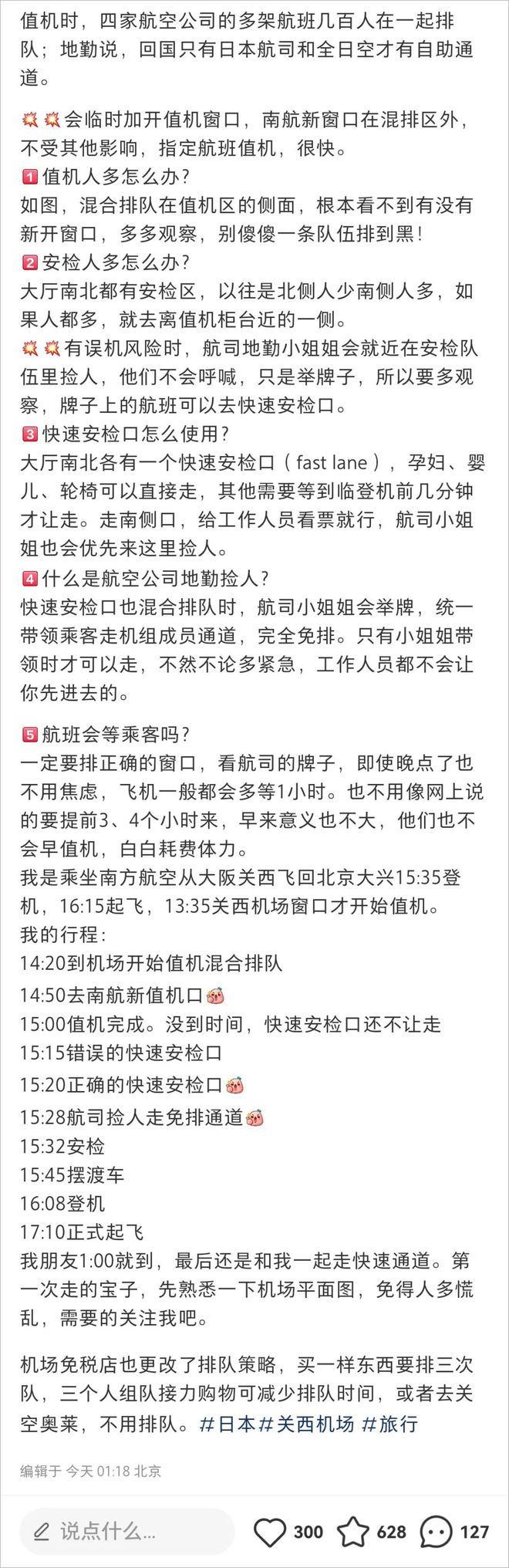 如果大家买了近期从关西机场回国的机票,记得早点机场,排队安检时间来不及时请留意航司安检/广播捞人。