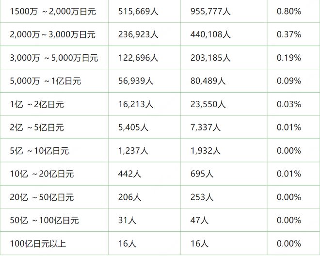 从下表可以看出年收入从0~500万日元的人数占比为73.1%,500万~1000万日元的人数占比为22.25%、1000万日元~1亿日元的人数占比为4.61%、年收入1亿日元以上的人数占比为0.04%左右。2019年日本人的平均年收入为436万4000日元,从下表这个数据来看,至少有60%的人没有达到平均年收入水平。怎么突然觉得日本人也生活得水深火热呢!