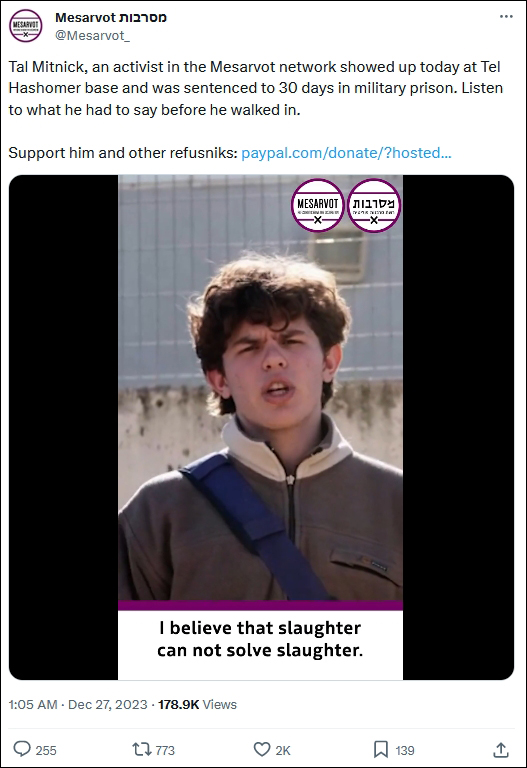 “我相信屠杀并不能根除屠杀”,据《以色列时报》12月28日报道,以色列18岁男孩塔勒·米特尼克(Tal Mitnick)因拒绝服兵役被判处在军事监狱服刑30天。报道称,他是本轮巴以冲突爆发以来,已知的第一例因出于良心拒服兵役被判刑者。