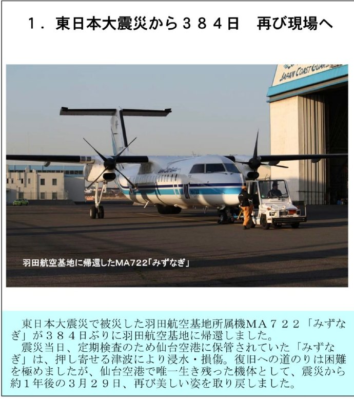 这次事故中海上保安厅(以下简称海保)的dash8飞机(MA722)是一架有故事的飞机。在2011年的“3·11”大地震中,这架飞机就在被海啸袭击的仙台机场之中,成为了当时唯一幸存的“泡水机”。这架“3·11”大地震的“幸存者”在经过一年多的修复后重返飞行,而这架飞机如今在又一场大地震后灾区运输物资的任务中发生事故,不由让人感慨造化弄人。