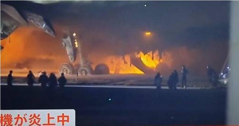 日航516机头着地与地面剧烈摩擦形成大量火光