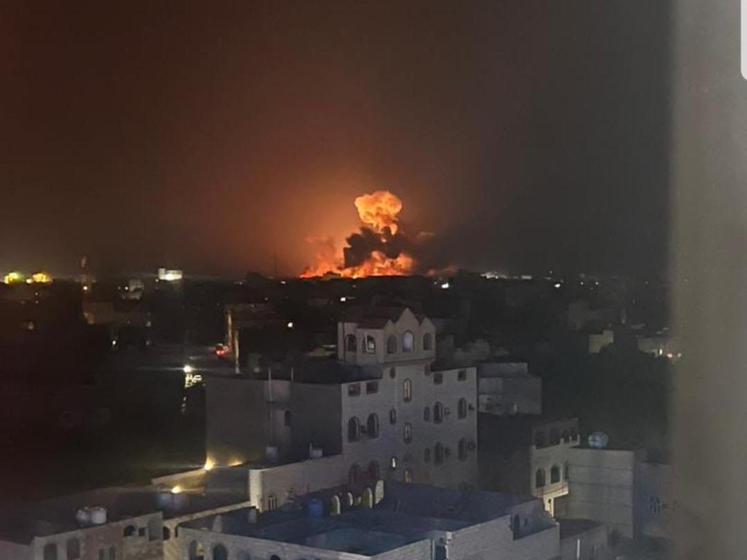 当地时间1月12日凌晨,在也门首都萨那拍摄的空袭画面 图源:新华社