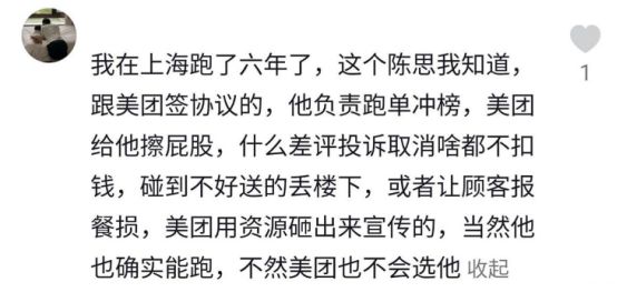 也有人质疑,陈思是跟美团签了跑单冲榜的协议的,美团想要拿陈思来树立典型,所以把陈思的那些投诉和差评都给取消了,只要数据漂亮就行。