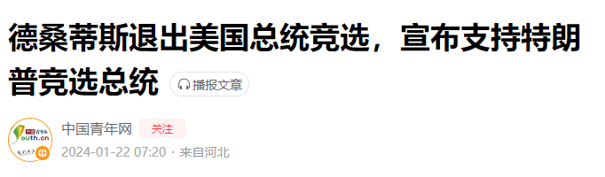 昨天出现一则大新闻:特朗普最大的竞争对手德桑蒂斯宣布退出2024年美国总统大选。当地时间1月21日,据美国有线电视新闻网(CNN)报道,美国佛罗里达州州长德桑蒂斯当日宣布退出2024年美国总统竞选,同时宣布支持特朗普竞选美国总统。据悉,德桑蒂斯在此前艾奥瓦州共和党总统初选中以21.2%的支持率排名第二。而根据一份最新民意调查数据显示,德桑蒂斯在即将于23日举行的新罕布什尔州共和党总统初选中的支持率仅为6%。