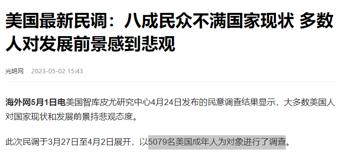 比如,2023年4月24日,皮尤研究中心就对5079名美国成年人进行了调查,最终得出“八成民众不满国家现状”的结论。