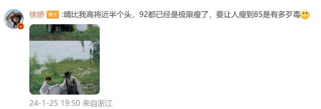 紧接着,徐娇又在评论区再怼道:“赵晴比我高将近半个头,92(斤)都已经是极限瘦了,要让人瘦到85(斤)是有多歹毒。”