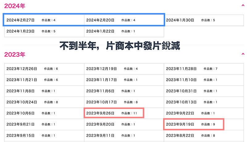 再来,还是新法的影响,由于新法让业界步调大乱,所以大家应该还记得之前片商发片量锐减,好不容易过了一段时间才调整回来;但其实调整的过程中片商是先消化之前在新法刚实施时被喊卡的拍摄计划,这也让2023年有段时间发片量暴增,而现在只是回归正常,此其二也。