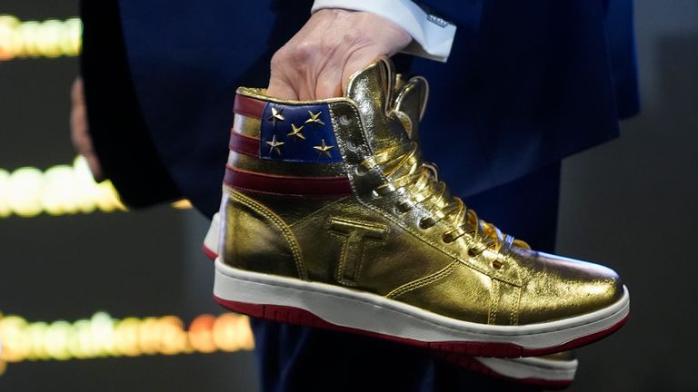 在费城会议中心,他向观众们展示了一款金光闪闪的高帮球鞋,靠近鞋口处印有美国国旗的图案,侧面还有代表着品牌的字母“T”标识。当特朗普表示这是他推出的首款官方球鞋时,现场爆发出巨大的欢呼声。