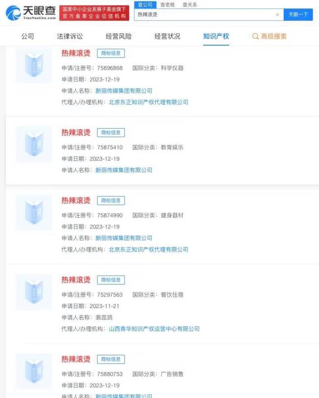 天眼查显示,目前与“热辣滚烫”相关的商标申请信息有10余条,国际分类涉及教育娱乐、广告销售、餐饮住宿等,当前商标状态均为等待实质审查,申请人包括该电影第一出品方新丽传媒集团有限公司,以及成都某餐饮管理公司、三河市某电子商务公司及自然人裴某某等。