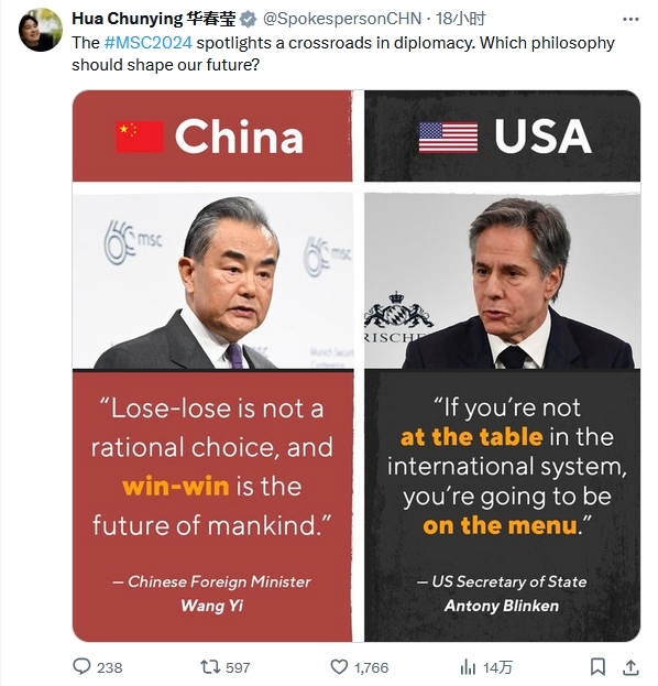 同样在慕尼黑安全会议上,中共中央政治局委员、外交部长王毅则发出“多输不是理性选择,共赢才是人类未来”的响亮呼吁。中国外交部部长助理、发言人华春莹22日在社交平台X上贴出对比图反问道:“2024慕尼黑安全会议凸显外交的十字路口。哪种哲学应该塑造我们的未来?”