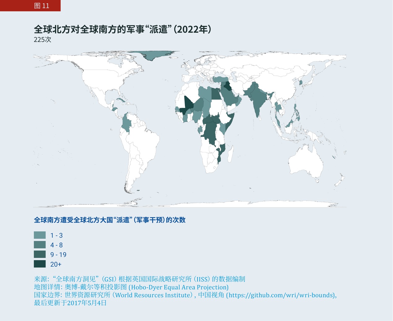 图11表明,非洲和西亚仍然是西方国家的焦点。2022年,以下五个国家遭受的外国军事派遣次数最多:马里(31次)、伊拉克(30次)、黎巴嫩(18次)、中非共和国(13次)和南苏丹(13次)[26]。