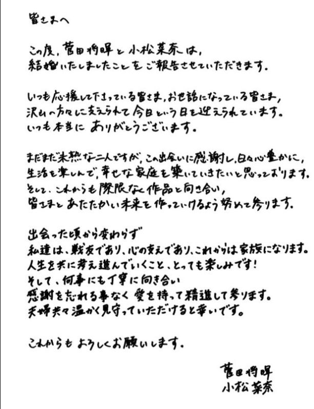 去年的9月21日的9点21分,菅田将晖在个人SNS账号,发出了一张与妻子小松菜奈的夫妻合照。