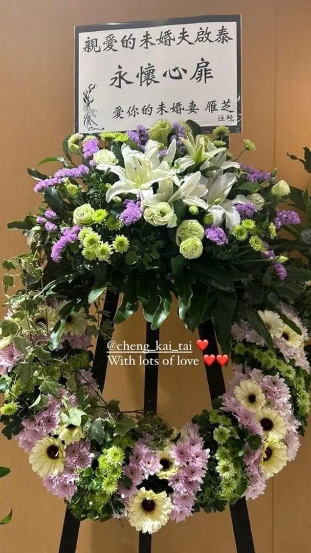 仪式在下午4点半结束,郑启泰未婚妻滚轴熘冰前香港代表队王雁芝虽然未有露面,但在社交网晒出花圈照,写着:“亲爱的未婚夫启泰 永怀心扉 ”下款写着“爱你的未婚妻雁芝”。