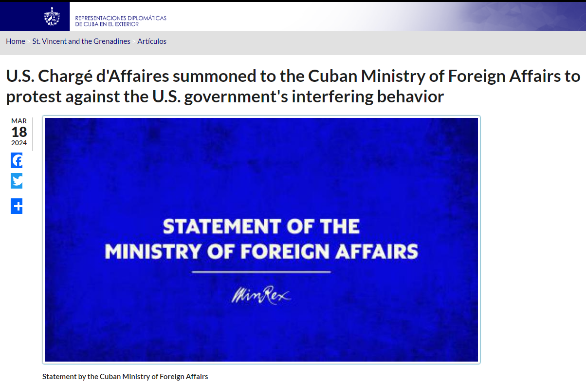(东方军事讯)3月17日,古巴多地发生抗议活动,次日(18日)古巴外交部网站发布声明称,当天古巴外交部副部长卡洛斯·费尔南德斯·德·科西奥(Carlos Fernández de Cossío)召见美国驻哈瓦那大使馆临时代办本杰明·齐夫(Benjamin Ziff),对美方试图煽动反政府骚动并干涉古巴内政表示坚决的反对。