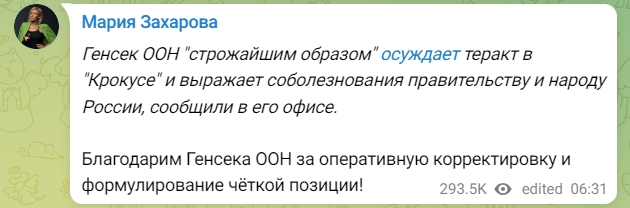 不久后,联合国官方网站更新声明。联合国秘书长副发言人法尔汉·哈克发表声明称,联合国秘书长古特雷斯以最强烈的言辞谴责发生在莫斯科近郊音乐厅的恐怖袭击,古特雷斯向遇难者家属、俄罗斯人民和俄罗斯政府致以深切慰问,希望伤者早日康复。