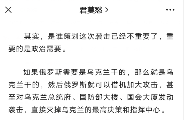 所以,在普京说出“恐怖分子向乌克兰方向逃跑”的时候,我立刻就得出结论:不管这件事和乌克兰有没有关系,俄罗斯必将这件事算到乌克兰头上。