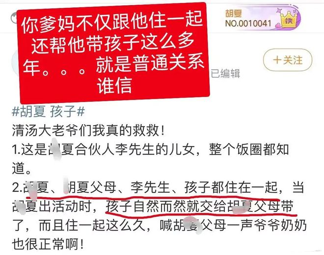 本来么,亲朋好友又是合伙人,帮忙看一下孩子也没什么,此事到此也可以告一段落了,但是有敏锐的网友,从中察觉出一点不寻常的味道,觉得即便是合伙人,李先生和胡夏关系也有点亲近了,他作为一个不差钱的成年男性,为什么会带着两个孩子,常年居住在胡夏的别墅里面?况且为什么是胡夏的父母照顾两个孩子,李先生请不起保姆还是他自己没有父母?他的父母还不如别人家老人对自己孙子上心?