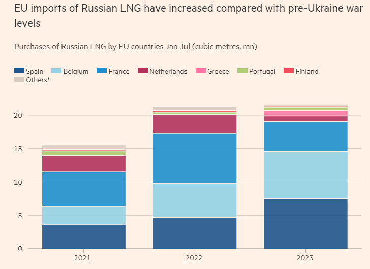 据英国《金融时报》8月29日报道,根据市场分析提供商Kpler的数据,今年1-7月,欧盟各国斥资约52.9亿欧元(约合420亿元人民币)进口了2160万立方米俄罗斯液化天然气,进口总量比2022年同期增长约1.7%。