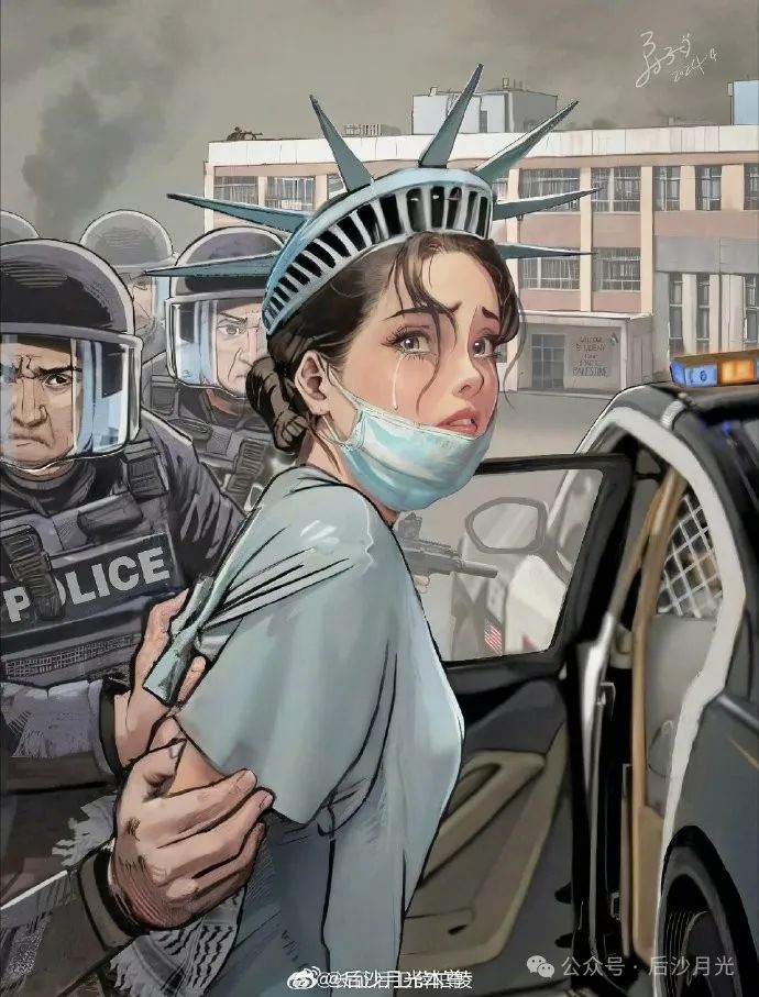 现在,美国大学声援巴勒斯坦运动正如火如荼,美国军警如临大敌,不仅闯入校园抓捕学生和老师,还动用了催泪弹、电击枪、橡皮子弹等制暴武器,甚至在学校制高点布置了狙击手。