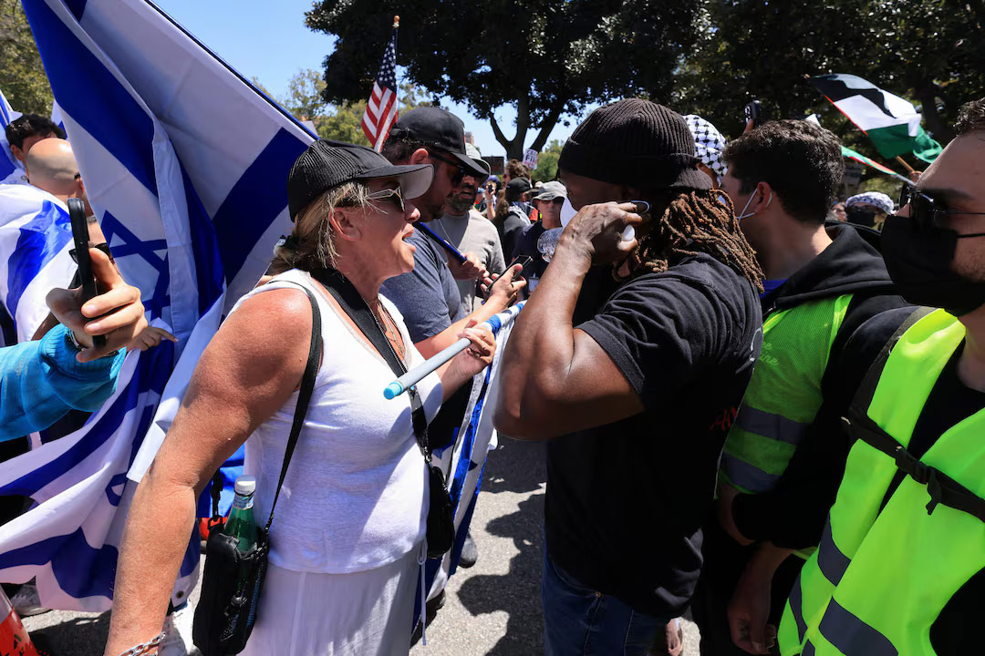 综合路透社、美国有线电视新闻网(CNN)当地时间4月28日报道,虽然加州大学洛杉矶分校的亲巴勒斯坦阵营的规模逐渐扩大,而亲以色列阵营的声音和可见度也愈发高涨,但双方此前一直都保持着“和平”。然而当天,两派示威者冲破了校方为隔开他们而设置的护栏,并相互推搡、高喊口号、辱骂对方,甚至伴随着互殴,直到手持警棍的校园警察最终将双方分开。