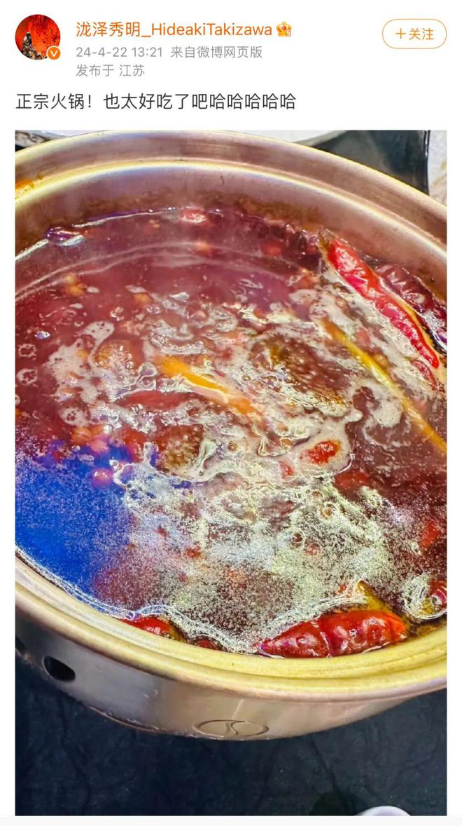 演出结束后,泷泽秀明还在自己的中国SNS上,晒出了吃四川火锅的照片。