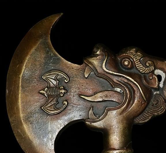 这把斧头上刻的其实是一只狮子,狮子的口中“吐”出斧身,斧身上还有个蝙蝠的花纹。