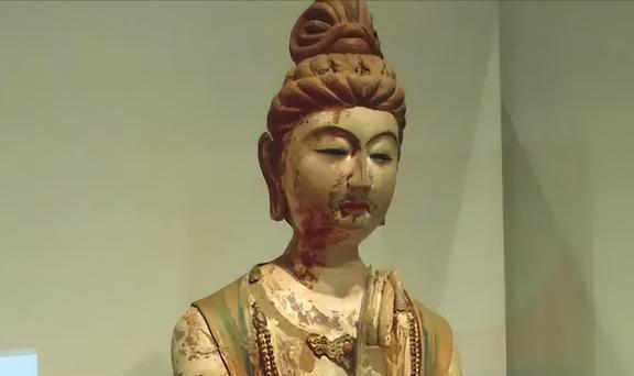 菩萨像在唐代彩塑中占有重要的位置,所塑造的菩萨造像,从形象和装扮上,基本是依据当时美人的典型形象,其座姿出现了一腿盘起、一腿下垂的半倚坐式。